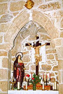 A los pies de la nave se sitúa el coro, elevado sobre un arco rebajado, que se sustenta en dos imágenes talladas en granito de un hombre y una mujer con el torso desnudo, a las que la tradición identifica con Adán y Eva.